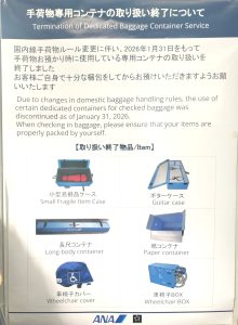 これに伴う手荷物ルールの変更により、国内線で手荷物お預かり時に使用している※専用コンテナの一部を2026年1月31日をもって終了します。手荷物をお預けの際はお客様自身で十分に梱包いただきますよう、お願いいたします。